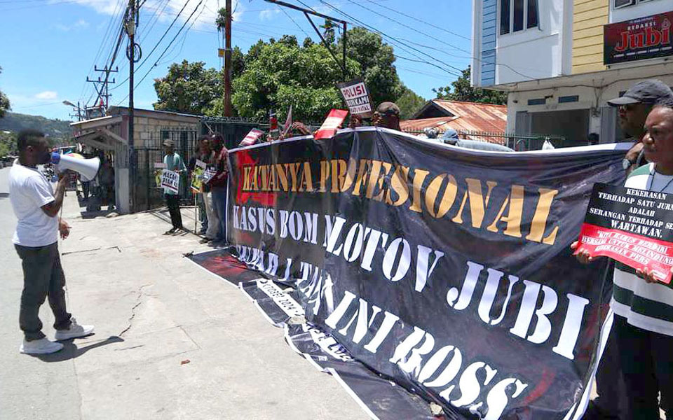 [Translated by James Balowski. The original title of the article was "Aksi Solidaritas Desak Polda Papua Tangkap dan Adili Pelaku Bom Molotov di Kantor Jubi".]