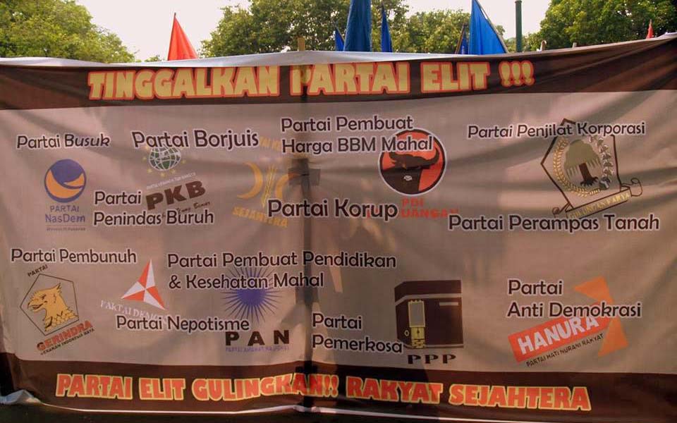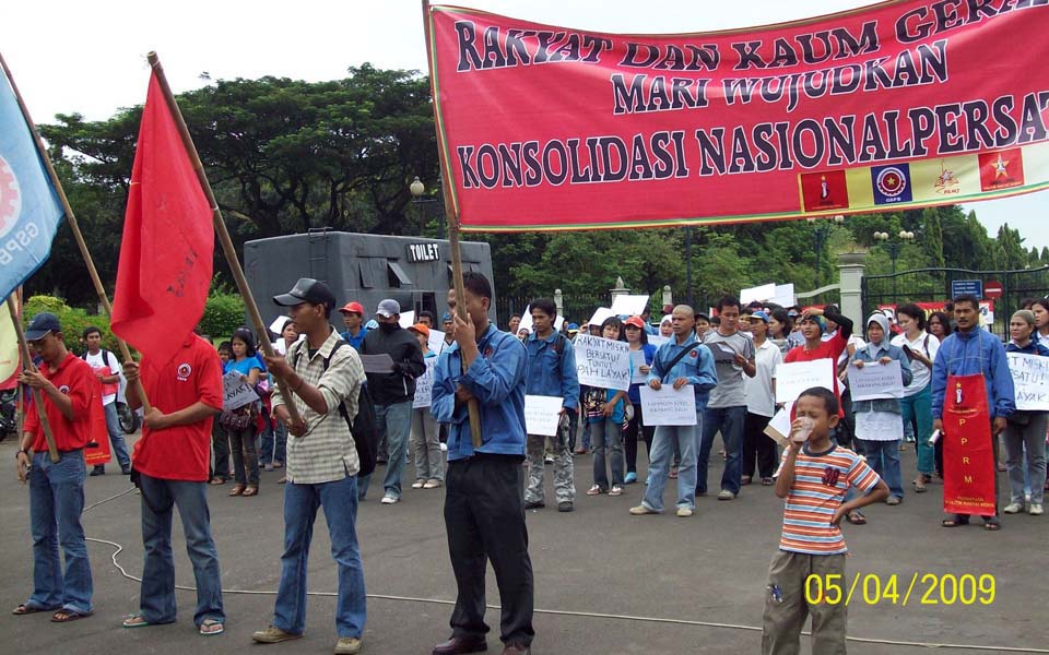 Medan – On April 5 scores of people from the North Sumatra Union for the Politics of the Poor Front (FPPRM-SU) held a protest action at the Mejestik roundabout in the North Sumatra city of Medan opposing the April 9 legislative elections.